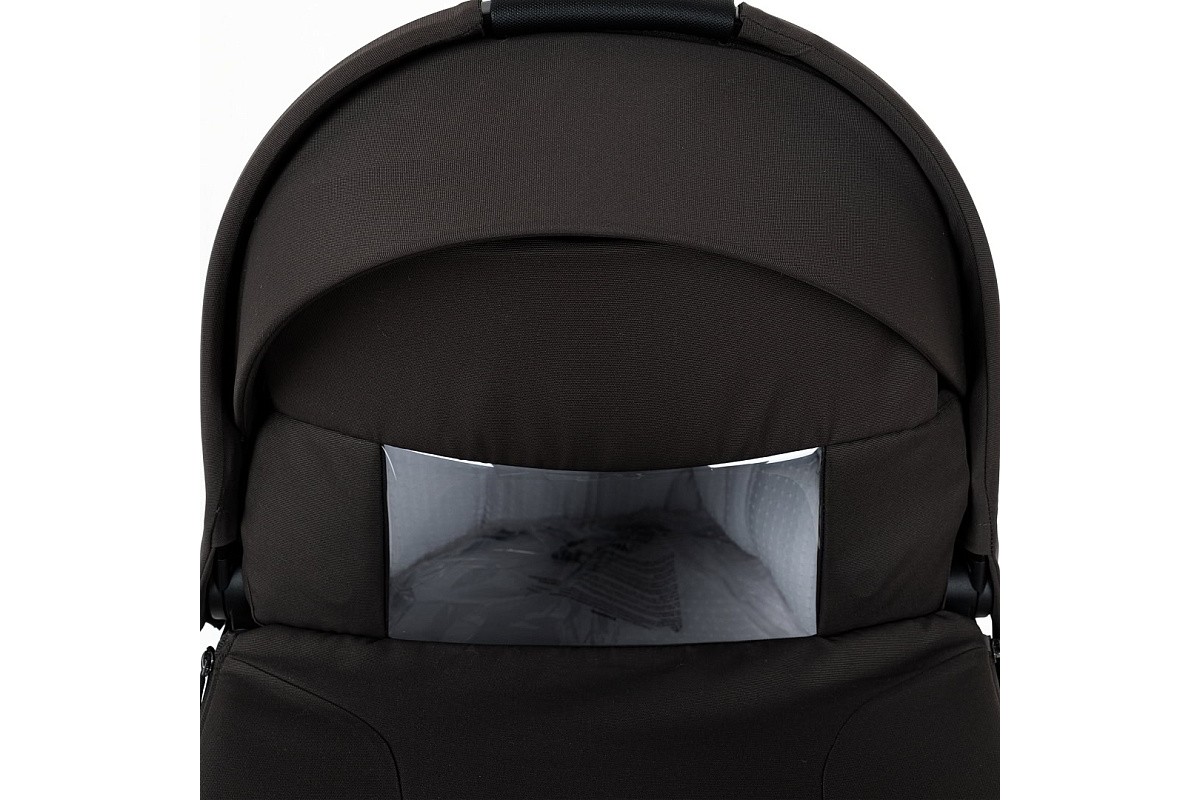 Капор люльки оборудован ручкой для переноски, имеется съемный козырек, дополнительная секция, климатическое окно под молнией в корпусе люльки и в капюшоне.