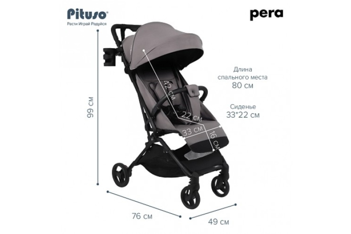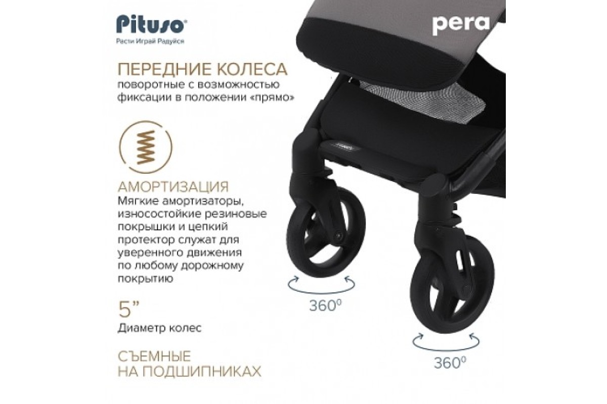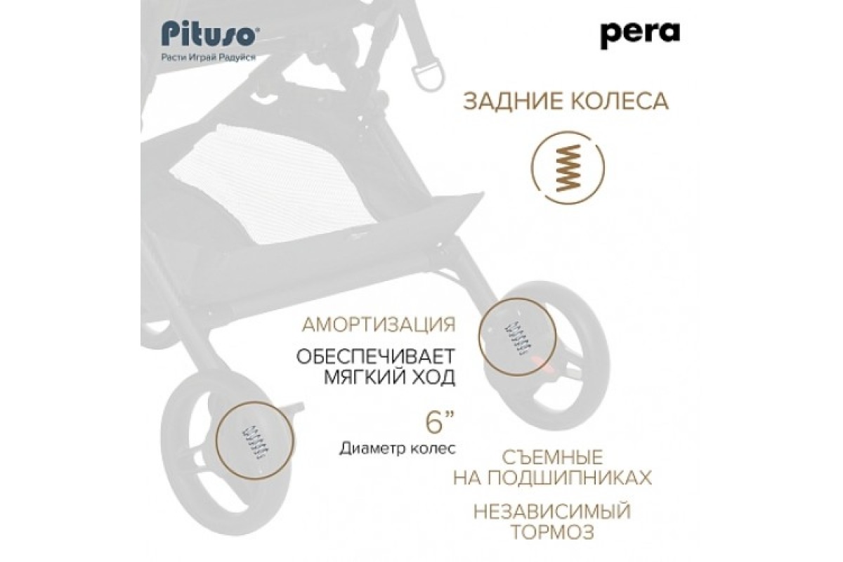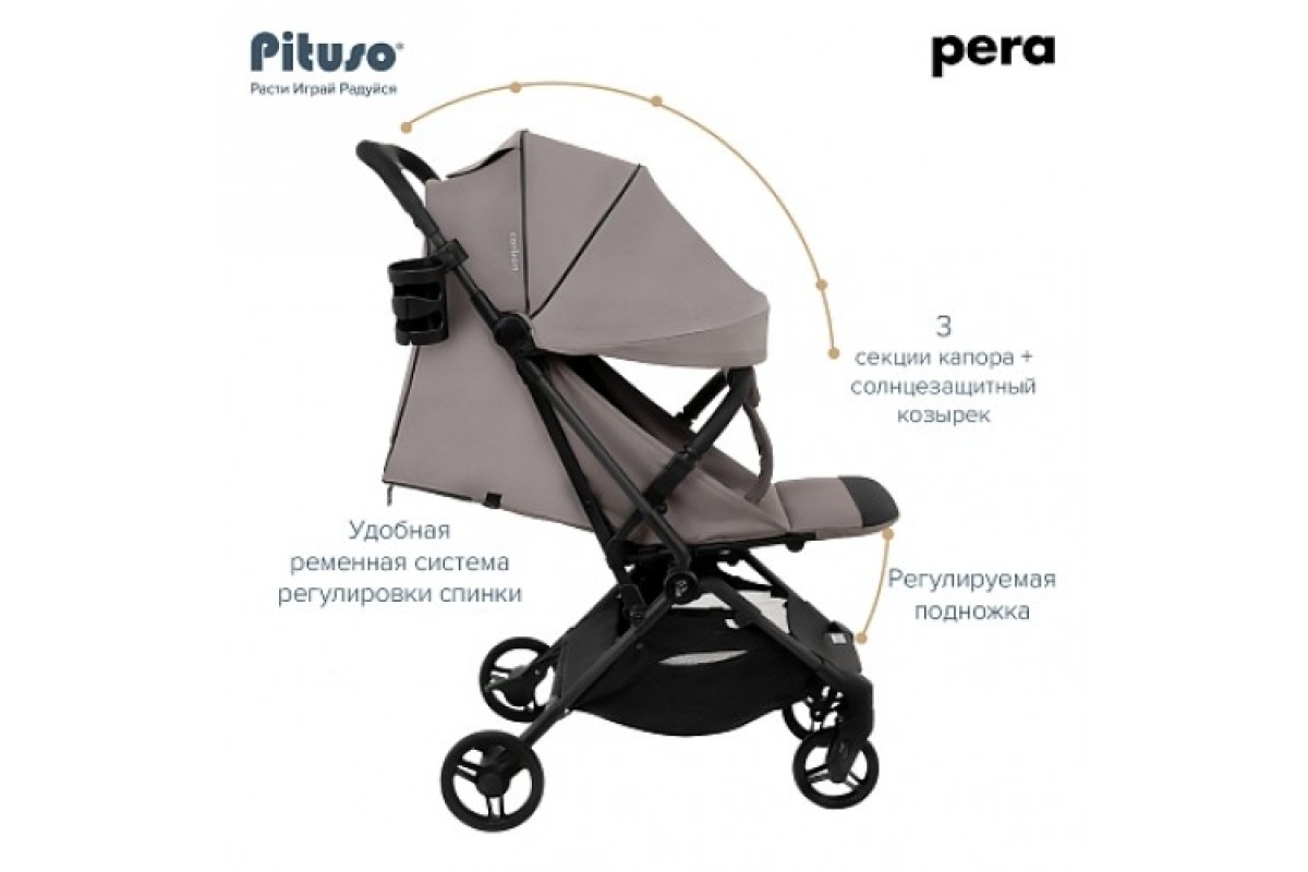 Спинка Pituso Pera Plus плавно и бесшумно регулируется при помощи ремней. Такая система по праву считается одной из самых надежных. Она не ломается и позволяет выбрать любой удобный вашему ребенку угол наклона: от вертикального до горизонтального. В комплекте предусмотрен мягкий матрасик-вкладыш. Он обеспечивает максимально удобную посадку, а также защищает коляску от грязи. Подножка выполнена из прочной сетки и легко чистится влажной салфеткой.