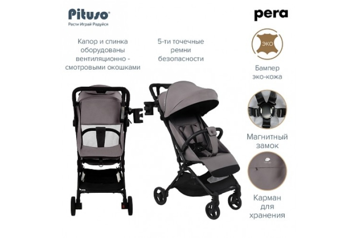 Ручка покрыта экокожей и имеет удобный хват. По центру расположена система сложения коляски. Сложить Pituso Pera Plus легко одной рукой. Она превращается в тоненькую маленькую книжку, которую удобно переносить на плечах при помощи предусмотренной сумки-рюкзака. Такая модель отлично подходит для путешествий, а также для родителей, живущих в многоквартирных домах без лифта.